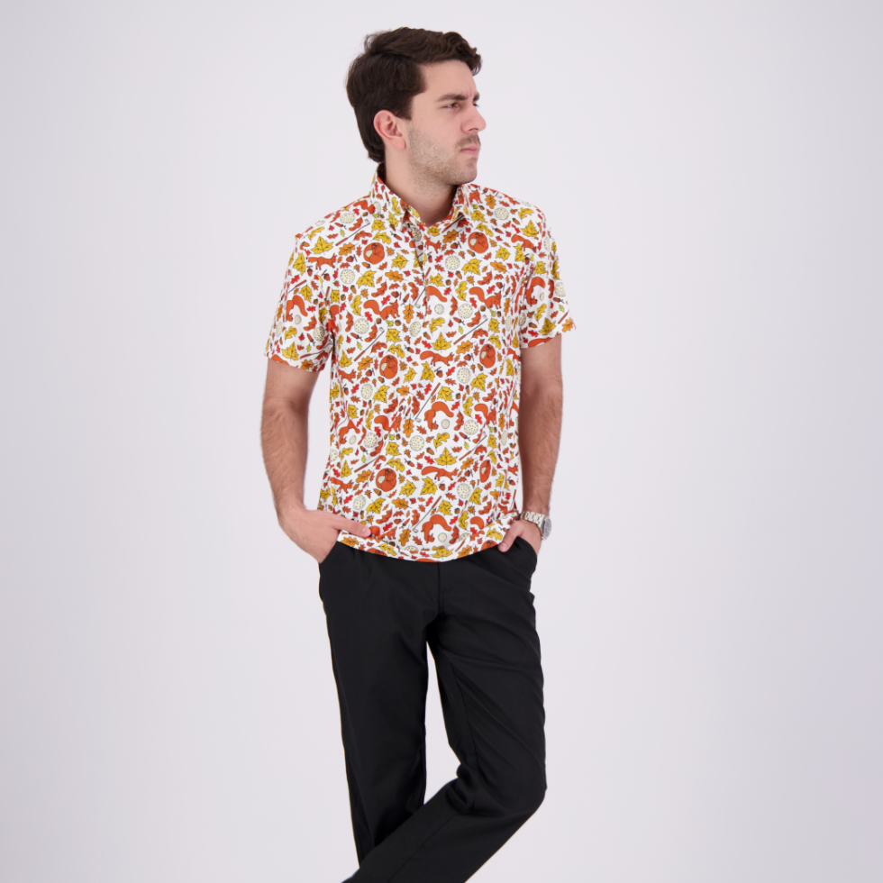 Camiseta de golf de manga corta con un elegante patrón de ardillas, hojas y ramas. Perfecta para mantener un aspecto fresco y sofisticado en el campo de golf, combinando estilo y comodidad. Su cuello tipo polo añade un toque clásico, ideal tanto para juegos casuales como para torneos. Disponible en varias tallas para garantizar un ajuste perfecto.