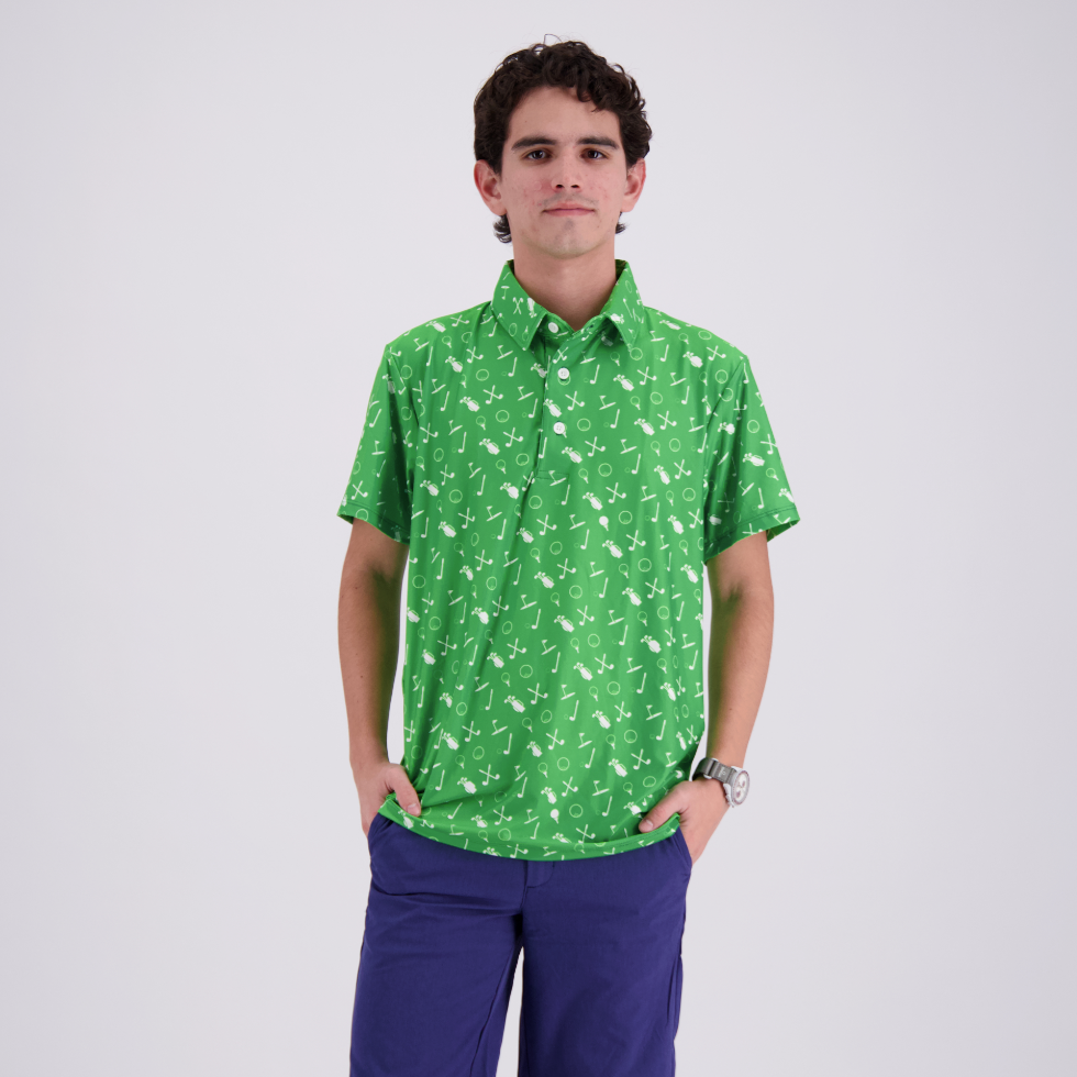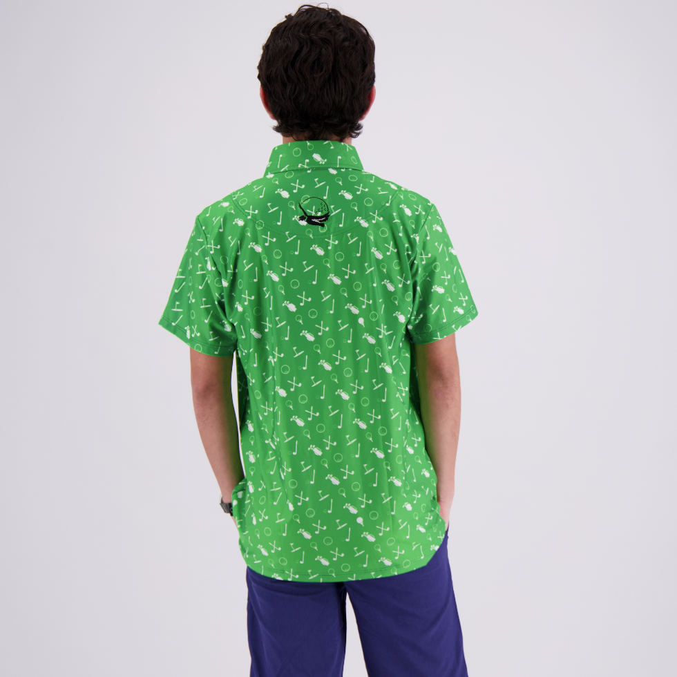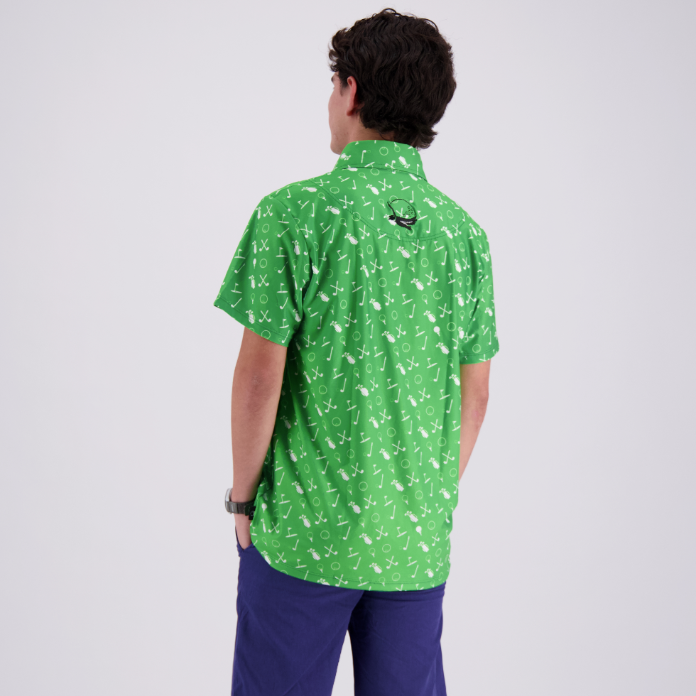 Camiseta de golf de manga corta con un elegante patrón de equipo de golf blanco sobre un fondo verde. Perfecta para mantener un aspecto fresco y sofisticado en el campo de golf, combinando estilo y comodidad. Su cuello tipo polo añade un toque clásico, ideal tanto para juegos casuales como para torneos. Disponible en varias tallas para garantizar un ajuste perfecto.