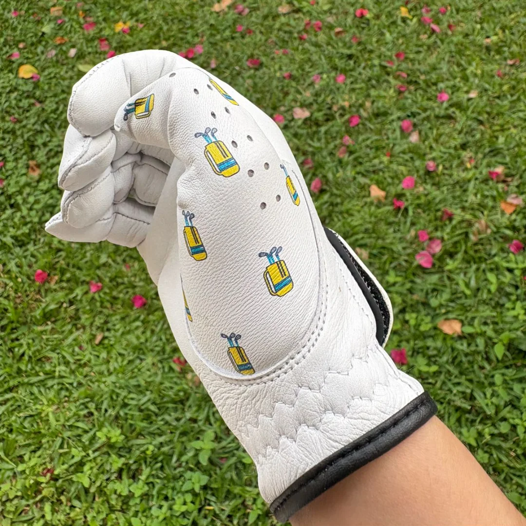Confeccionados en piel de cabreta 100%, estos guantes de golf combinan flexibilidad natural y agarre confiable. Su diseño divertido con bolsas amarillas y palos azules es ideal para quienes juegan con estilo, pero sin tomarse demasiado en serio.